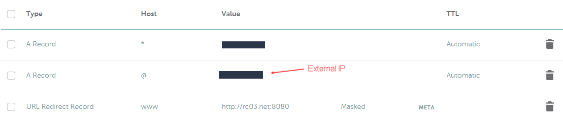 Type: A record; Host: @; Value: <external-ip>; TTL: Automatic