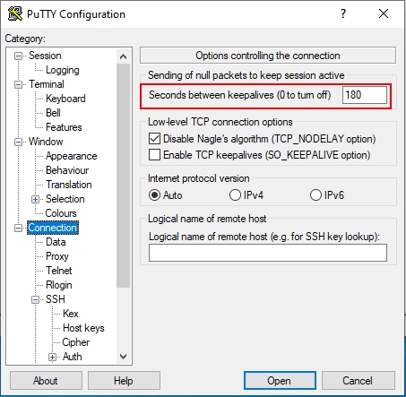 – 2.2. (Optional) Configure keepalives. Click on Connection, and set the value as needed