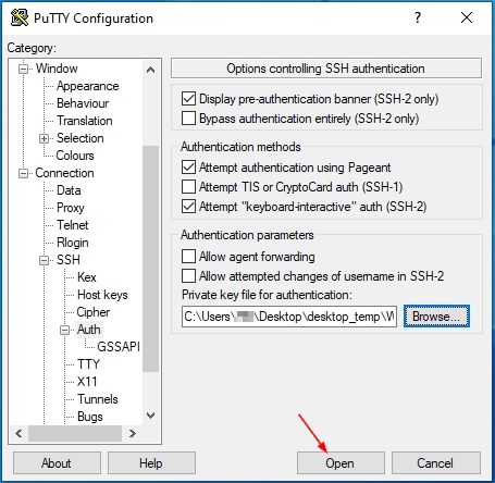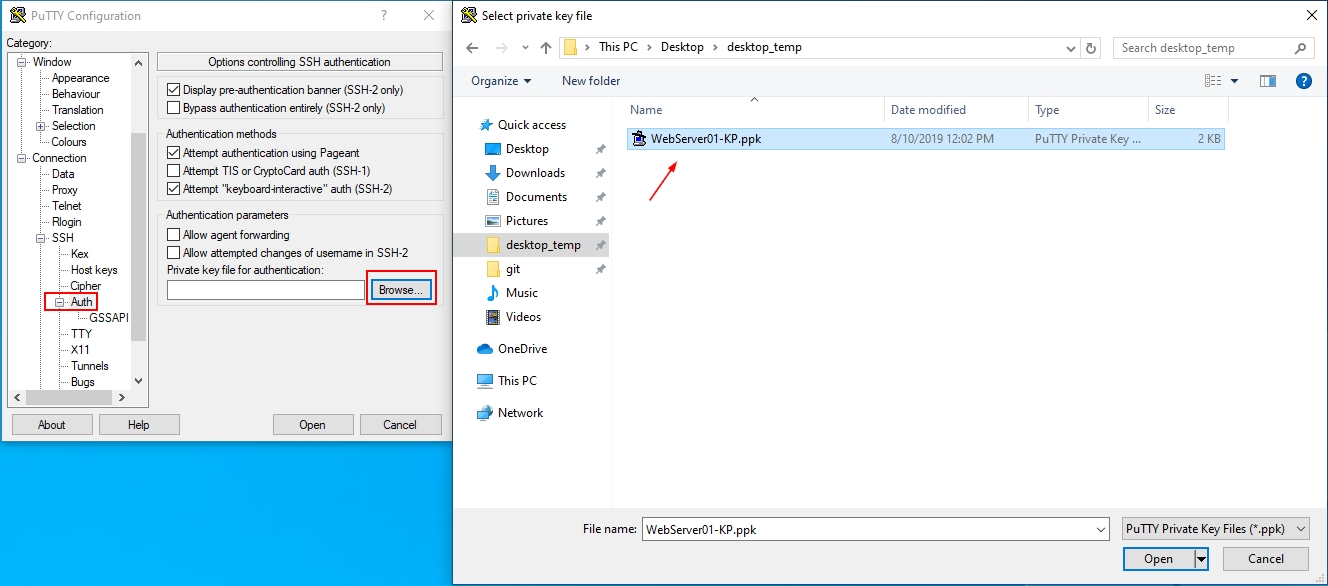 – 2.3. Expand, SSH and select Auth. Click on the Browser button and navigate to the location where the private key generated by PuTTY, and click Open