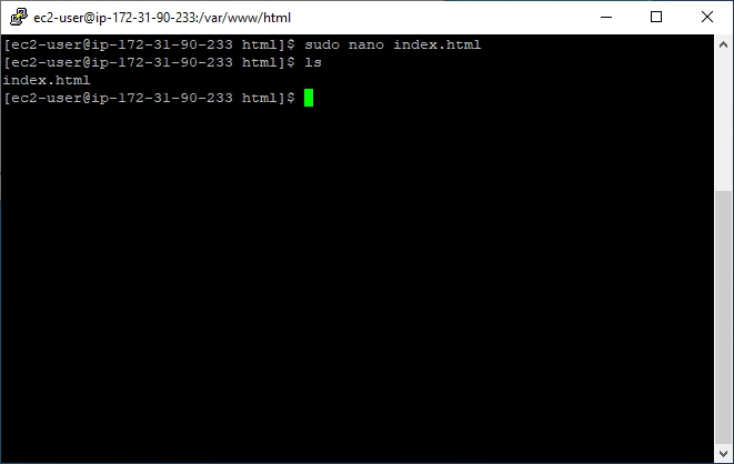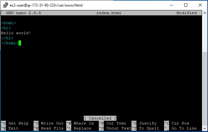 - Now, we will add an index.html to this directory using nono text editor. Type the following -