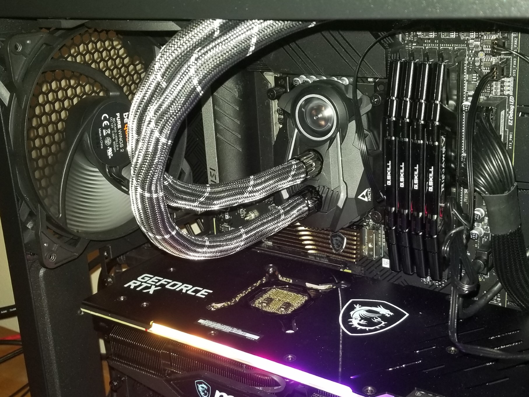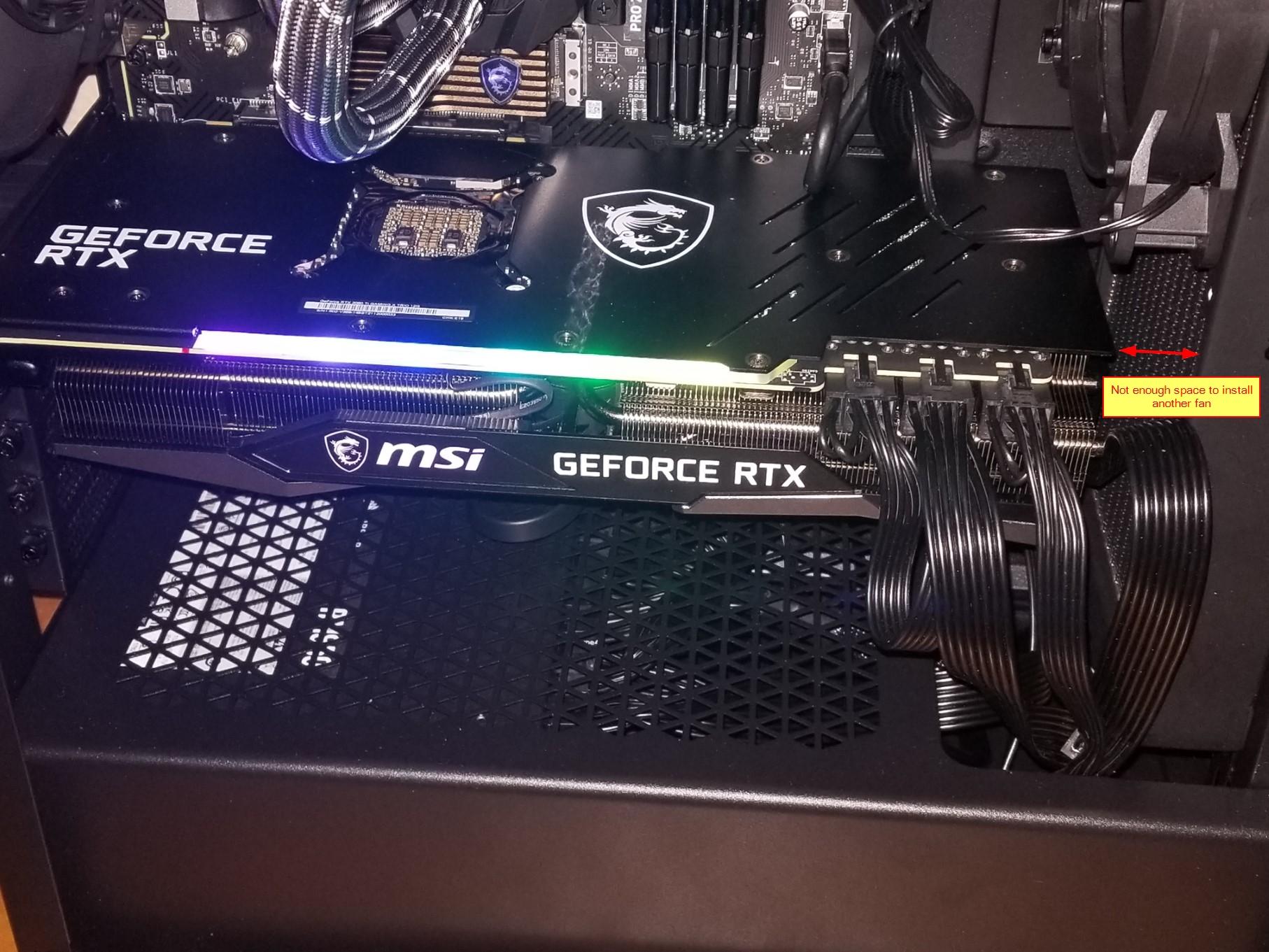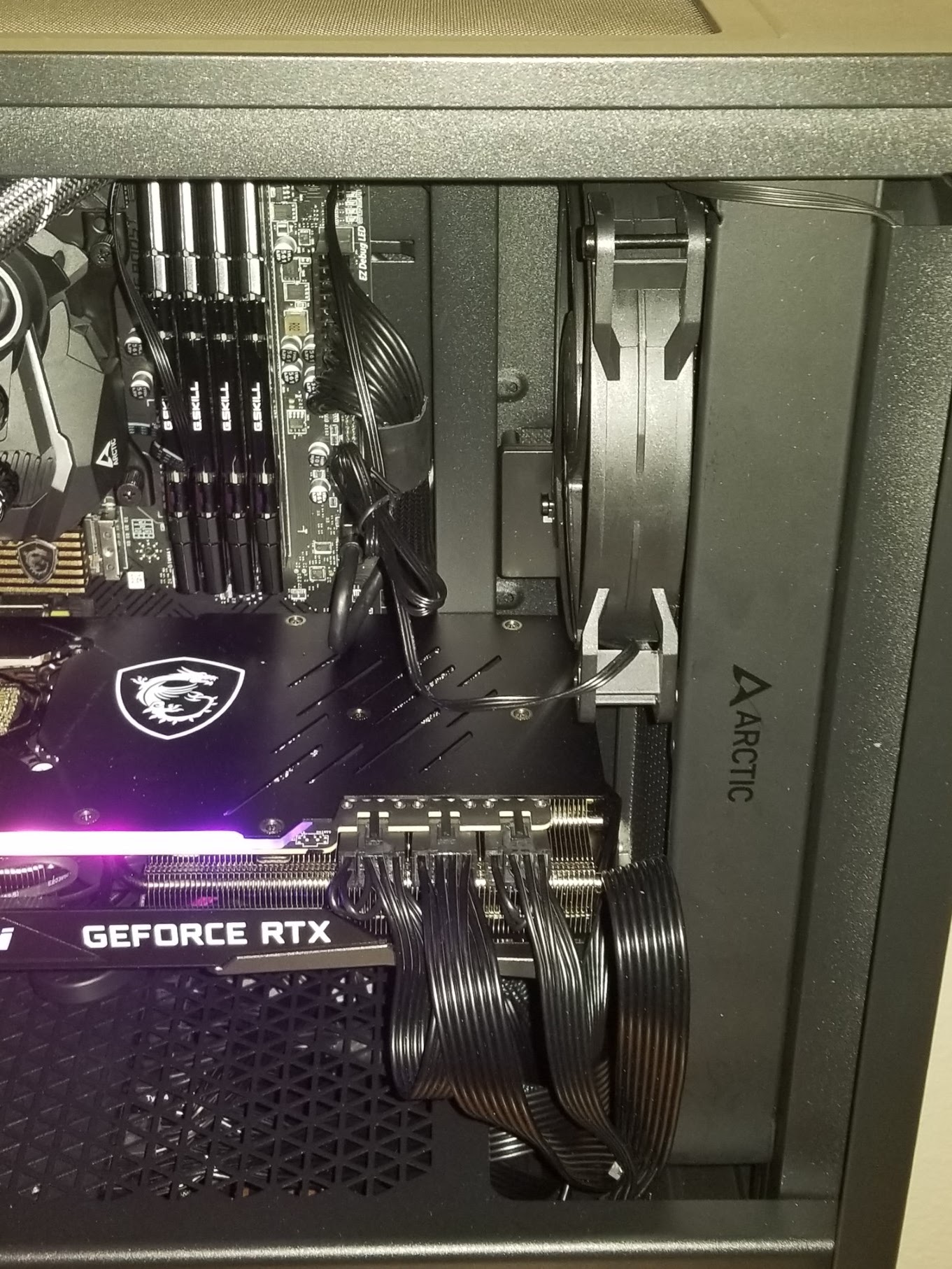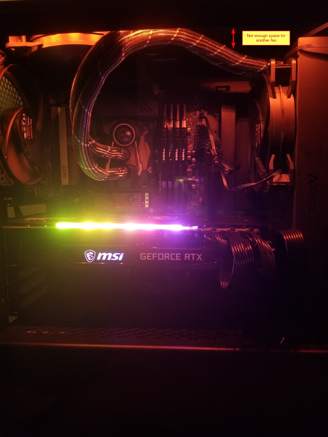 The second issue is the length of the case. While the case is barely spacious enough to accommodate as MSI GeForce RTX 3080 Ti 12 GB GAMING X TRIO. There is not enough clearance between the GPU and the radiator to mount a fan on the radiator. For this reason, I had to switch the position of the fans and mount them on the front frame of the case. Its not a big deal, but a full push pull configuration is not possible. There is only enough room for one fan in the pull config.
