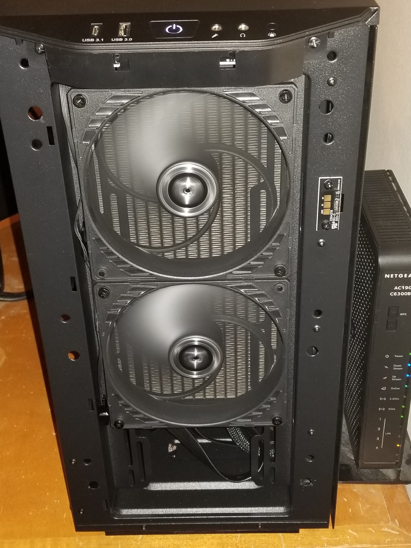 The height of the case prevents me from mounting two exhaust fans on the top of the case; the tubing from the radiator uses all the room needed for one fan, therefore I only mount one top exhaust fan. So now, I am left with a spare 140mm fan, and I decided to mount it on the radiator to pull air out. So I now have a full push, and half pull config. Not ideal, but it works just fine.