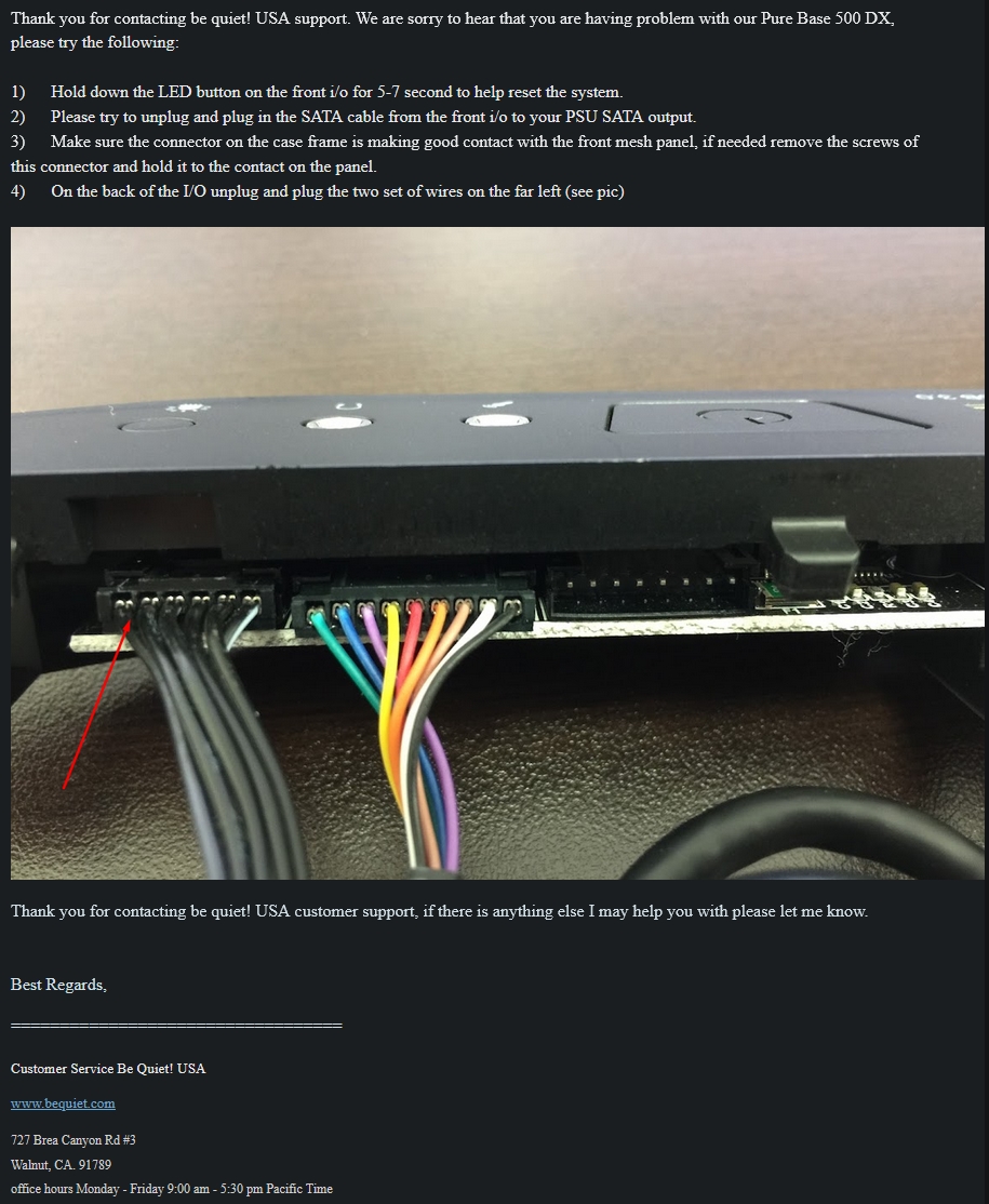 However, I did have an issue getting all this to work. After I finished the assembly, RGB lighting wouldn’t work. I checked the SATA power cable, and everything seemed fine. I thought something was wrong with the front panel (more on that in a bit). I contacted the support fully expecting them to give me some generic answer.