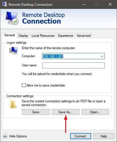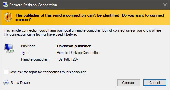 - Once the file is saved, double click on it, so launch Remote Desktop Connection and click on Connect. Click Yes on the next dialog box to connect despite certificate errors.