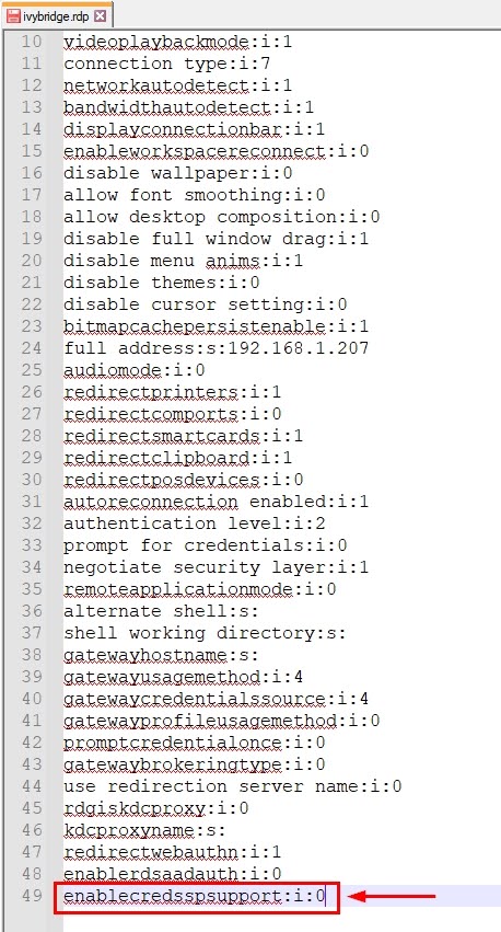 - Add the following to the bottom of the file and save it. This option will turn off the Network Level Authentication therefore the user will be prompted to enter the password up on connecting to the server.